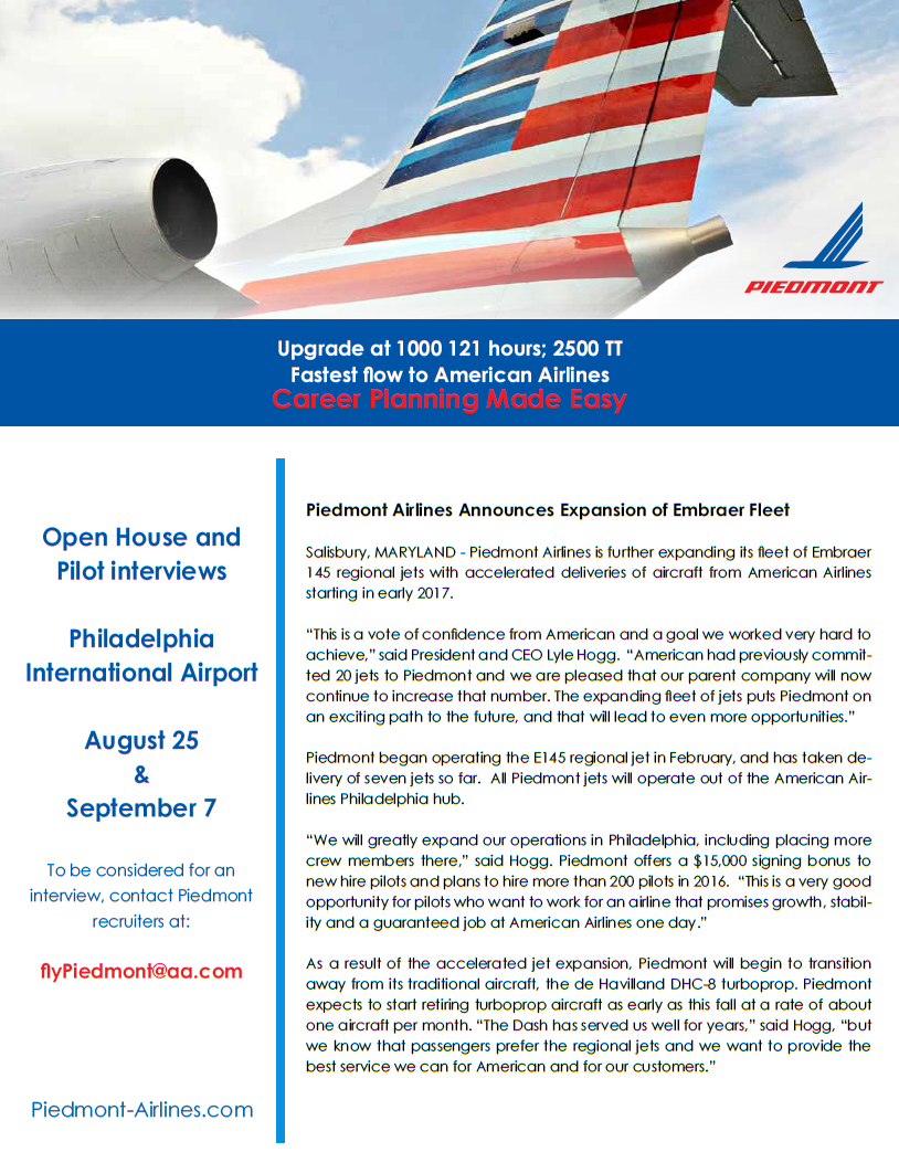Piedmont Airlines Announces Expansion of Embraer Fleet