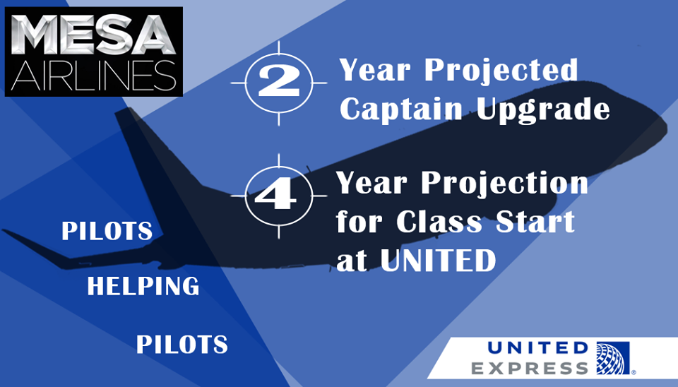 Upgrade to Captain on a large regional jet within 2 years, and start ground school with United within 4 years! If you are ready to begin your career, visit our "Pilot Careers" page on our website, www.mesa-air.com!