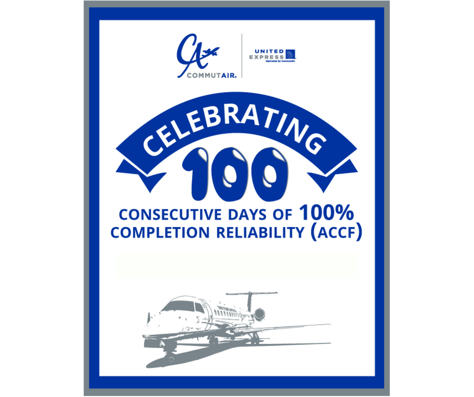Last Friday CommutAir celebrated 100 Days of no controllable cancellations. Great job by all their crews and employees on achieving this milestone and keeping the streak alive! Reliability equals quality of life for all! #anotherone