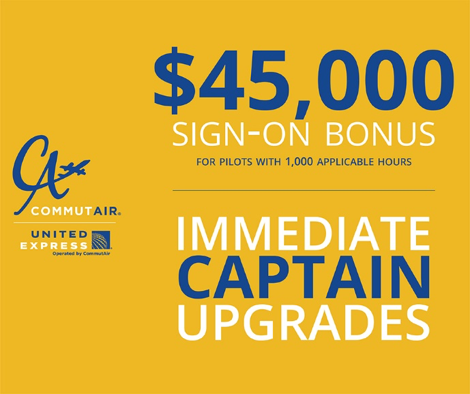 Make your new year resolutions come true by taking advantage of CommutAir’s immediate upgrades via their Captain Accelerated Program. CommutAir is offering a $45,000 sign-on bonus for captain-eligible pilots